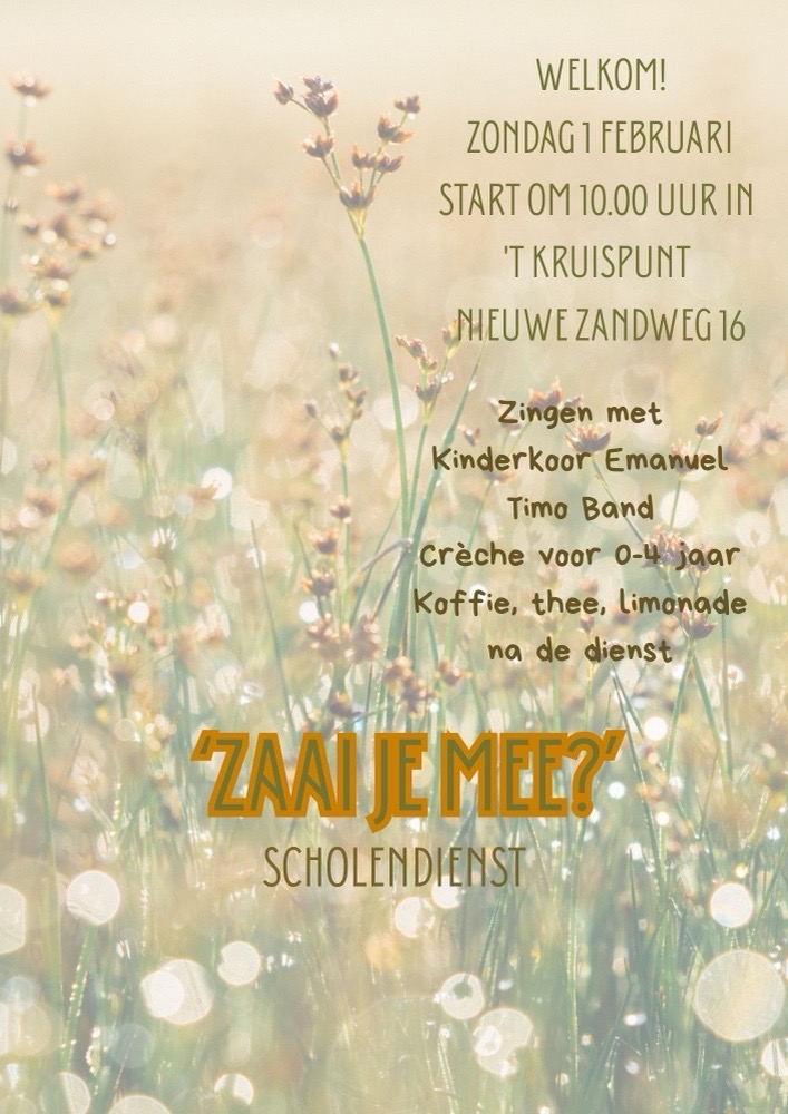![]() Dit is een speciale viering waarin we samen zingen, luisteren naar een verhaal en nadenken over wat belangrijk is in het leven. We hopen dat jullie samen met ons komen vieren. Het wordt een fijne en gezellige dienst voor jong en oud! | ||
